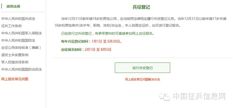 在这个页面中,会告知我们报名时间以及参军的政策说明,建议看后,点击“进行兵役登记”,迈出你军旅生涯的第一步吧!