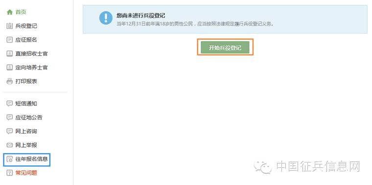 登录系统以后,是一个崭新的页面,这个时候我们就需要兵分两路啦!曾经报过名的小伙伴可以直接点击左侧的“往年报名信息”进行信息的更新和补完。而没报过名的小伙伴们就可以点击右侧的“开始兵役登记”进行报名工作啦!