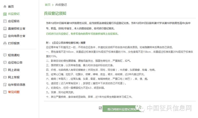 开始报名后你会发现跟所有的软件安装一样,会让你阅读一大篇的使用说明。我们十分不建议你跟安装软件一样,直接点确定。在这个时候请详细阅读!详细阅读!详细阅读(重要的事情说三遍)兵役登记须知。了解自己的各方面情况是否达标,这能避免后续工作出现的很多麻烦哦!
