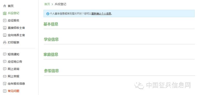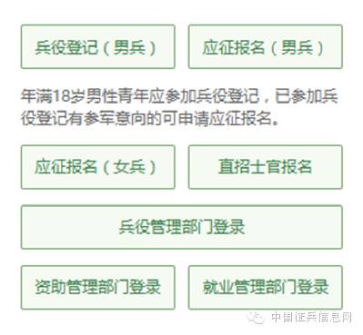 编者语:有些小伙伴看到这么多的菜单就有些懵了,其实不用紧张,如果你是第一次来的男生,直接从“兵役登记(男兵)”进入页面就可以了;否则就从“应征报名(男兵)”进入页面;如果想报名直招士官,就从“直招士官报名”进入页面。